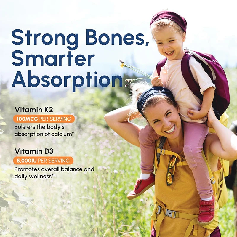 Healthy bones and teeth - Adults of all ages can benefit from the absorption of calcium when taking this potent and easy to swallow D3+K2 supplement. As age increases, supplementing with K2 and D3 may help maintain healthy and strong bones and teeth.