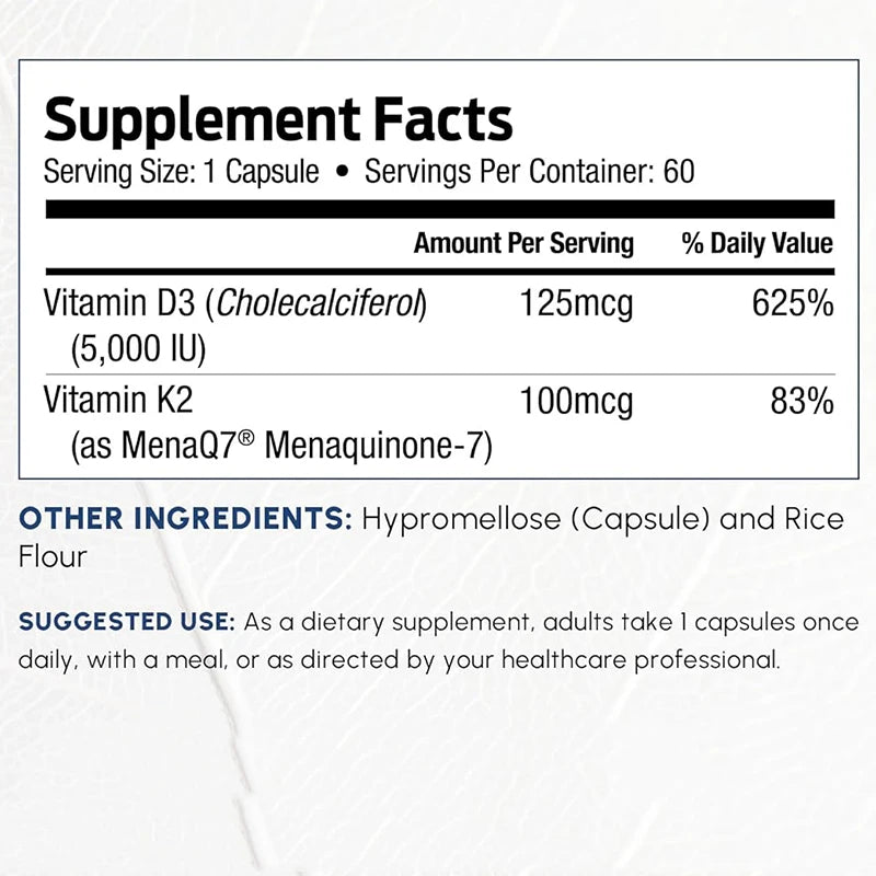D3+K2- Vitamin D3 ensures easy absorption of calcium, while vitamin K2 is responsible for activating proteins that integrate calcium into the bones. The potent combination of D3+K2 (MK7 naphthoquinone-7) works together to help our body harness the benefits of calcium from supplements or diets.