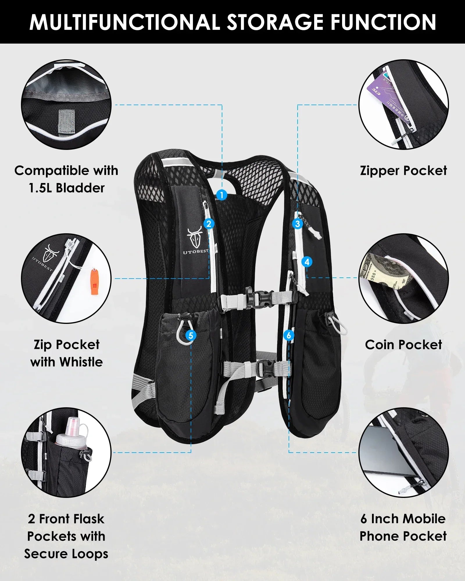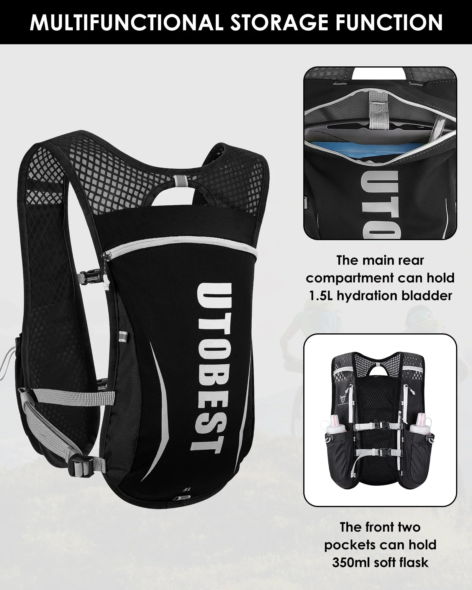 UTOBEST Ultra Lightweight Trail Running Hydration Vest - 5L Backpack with 1.5L Water Bladder